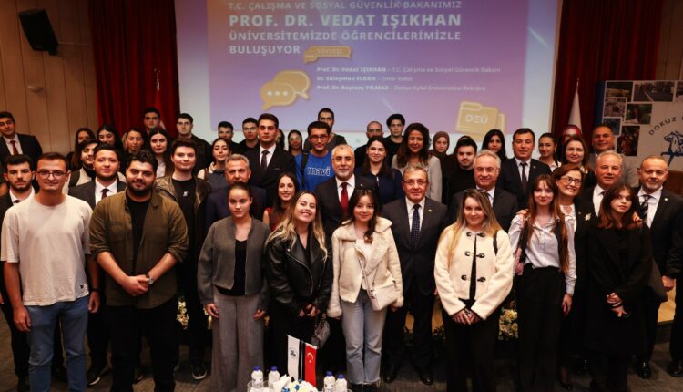 T.C. Çalışma ve Sosyal Güvenlik Bakanı Prof. Dr. Vedat Işıkhan, İŞKUR Gençlik Programı kapsamında Dokuz Eylül Üniversitesi öğrencileriyle buluşarak genç istihdamına ilişkin değerlendirmelerde bulundu ve öğrencilerin sorularını yanıtladı.
