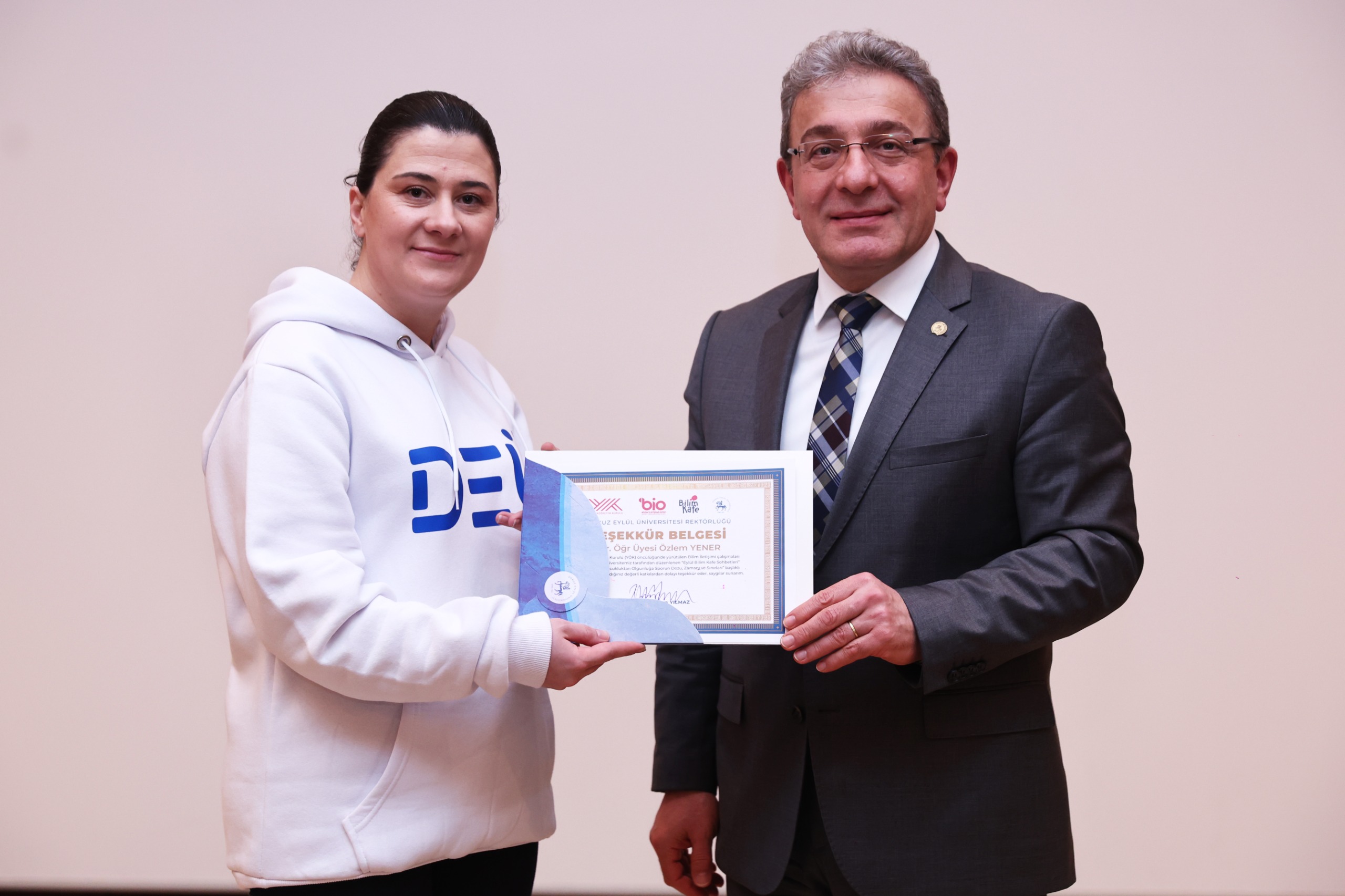 Bilim Kafe Sohbetleri, katılımcıların sorularının yanıtlandığı interaktif bölümün ardından sona erdi. Programın sonunda DEÜ Rektörü Prof. Dr. Bayram Yılmaz, Dr. Öğr. Üyesi Özlem Yener’e teşekkür belgesi takdim etti.