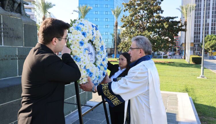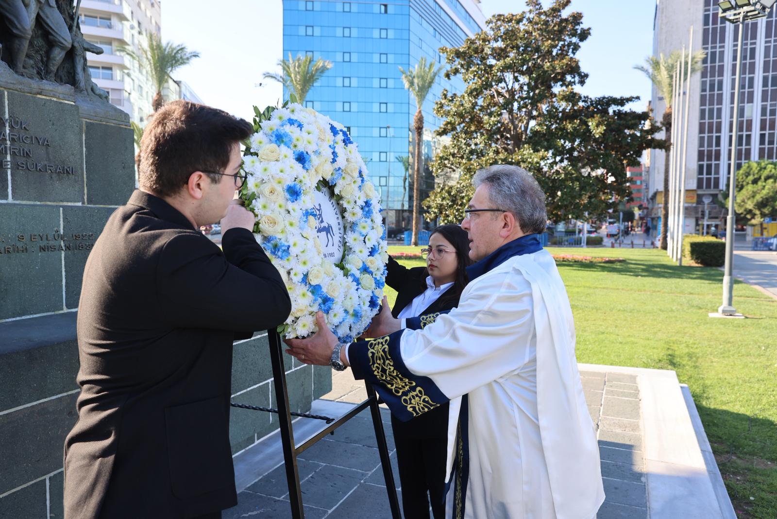 YENİ AKADEMİK YIL COŞKUYLA BAŞLADIDEÜ Rektörlüğü, akademik yıl açılışı nedeniyle İzmir Cumhuriyet Meydanı’nda da bir tören düzenledi. Rektör Prof. Dr. Bayram Yılmaz, Atatürk Anıtı’na çelenk sundu.
