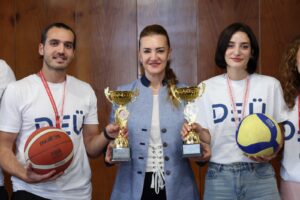 Gençlik ve Spor Bakanlığı tarafından Cumhuriyet’in kuruluşunun 100’üncü yılı kutlamaları kapsamında İzmir’de düzenlenen Kamu Spor Oyunları’na Dokuz Eylül Üniversitesi (DEÜ) damgasını vurdu. Turnuvada DEÜ’lü sporcular, 3×3 Erkek Basketbol turnuvasında birincilik; Kadın Voleybolunda ise ikincilik elde ettiler. Tamamı doktorlardan oluşan sporcular, başarılarını paylaşmak için DEÜ Rektörü Prof. Dr. Nükhet Hotar’ı ziyaret ettiler.