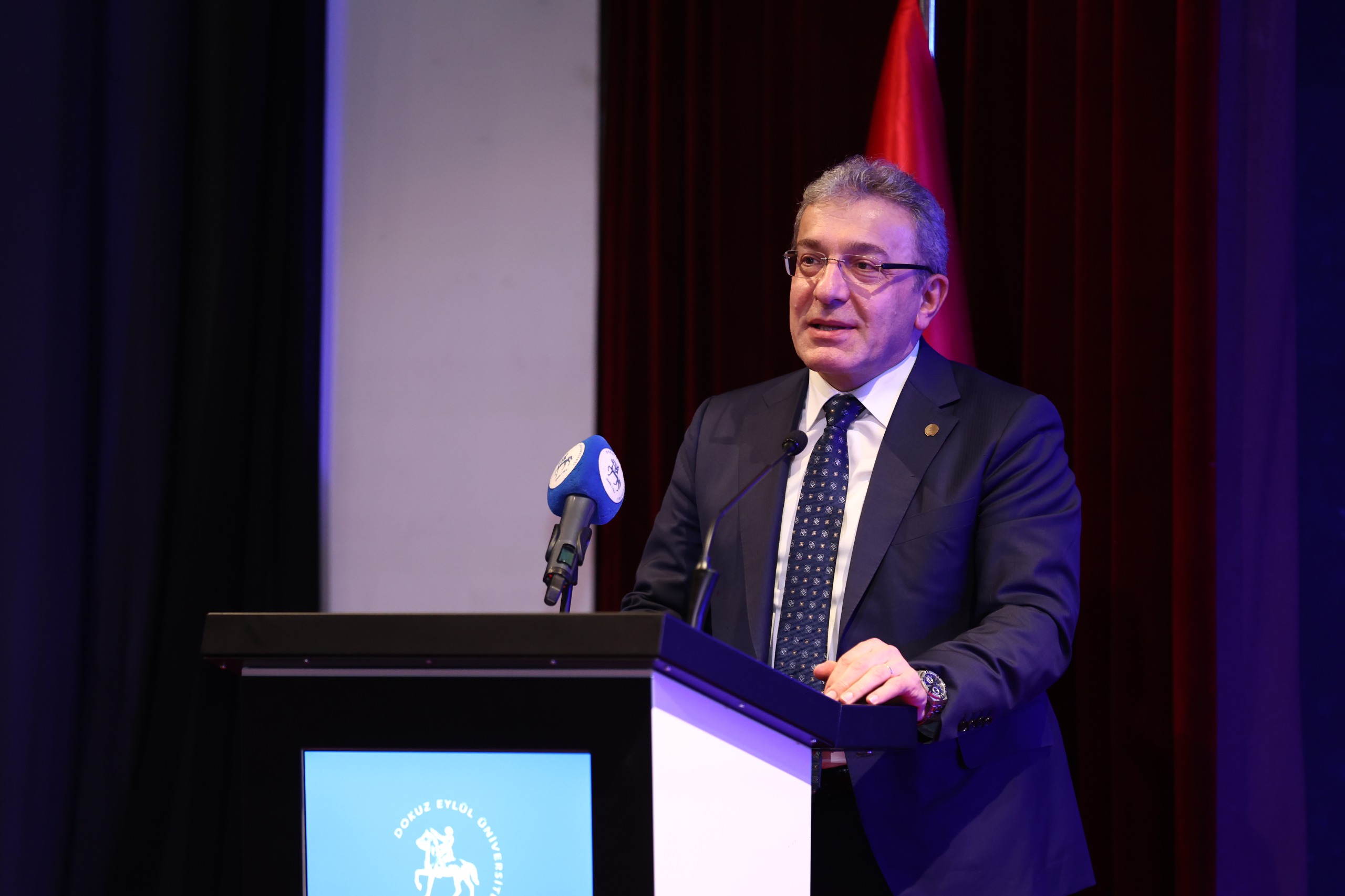 Etkinliğin açılışında konuşan Rektör Prof. Dr. Bayram Yılmaz, DEÜ’nün Türkiye’nin köklü araştırma üniversitelerinden biri olduğuna dikkat çekerek, “Dokuz Eylül Üniversitesi, büyük bir araştırma üniversitesi; 60 binden fazla öğrencimiz var. 18 fakültemiz, 10 enstitümüz, 7 yüksekokulumuz ve 1 konservatuvarımızla komple bir üniversiteyiz. Fakültelerimizin her biri bizim göz bebeğimiz, başımızın tacıdır. Üniversitemizi ben hep Selçuklu kartalına benzetirim. Fen bilimleri ile mühendislik bilimlerini ise bu kartalın kanatlarına… Sosyal bilimler ise bizim istikametimiz, yönümüz. O bakımdan tüm fakültelerimizin varlığı bizim için çok çok kıymetli. Hiçbiri bir diğerinden daha az önemli değil” ifadelerini kullandı.